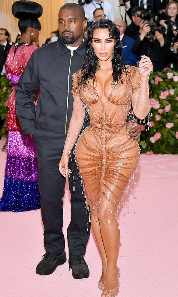 Ким Кардашян явилась в платье от Maison Mugler, которое идеально подходило для демонстрации культовых изгибов её знаменитого тела, а детали из бисера создавали иллюзию, что звезда попала под дождь.