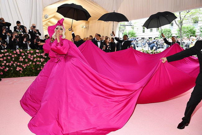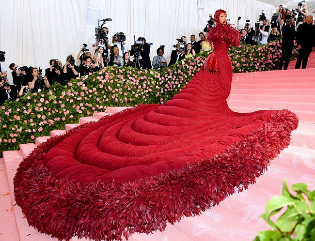 Приглашённые не подвели. Один наряд был экстравагантнее другого. Всех поразило гигантское платье Карди Б от дизайнера Тома Брауна. 35 человек потратили на его создание более 2000 часов. Драматически чрезмерный шлейф развевался позади исполнительницы на розовом ковре.