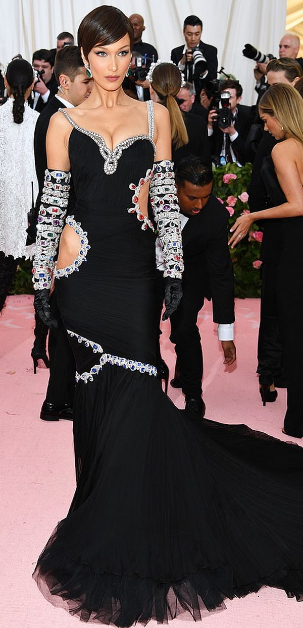 Белла Хадид оказалась одной из самых притягательных звёзд вечера, выйдя в элегантном черном платье Moschino с вырезом на бедре.