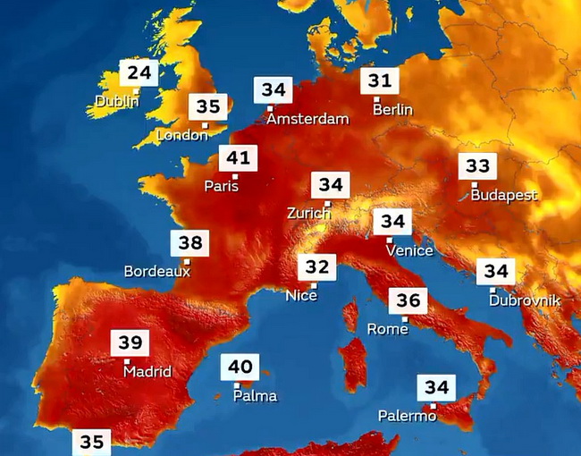 Западная Европа вновь во власти аномального зноя. Сюда пришёл горячий воздух из Африки, где уже не первую неделю царит невыносимая жара. В Париже столбик термометра поднимется выше сорокаградусной отметки. В Лондоне ожидают температурного рекорда (плюс 35). Отдыхающие на Балеарских островах задыхаются от жары.