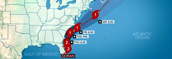 Утром в среду по Москве «Дориан» находится примерно в 177 километрах к востоку от мыса Канаверал, штат Флорида, с максимальными устойчивыми ветрами 177 км в час. Ураган немного ускорился и движется на север со скоростью 19 километров в час. Одно время он практически стоял на месте. Под угрозой теперь побережье Южной и Северной Каролины, где наводнения могут быть очень сильными.