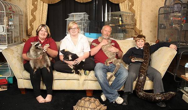 В доме англичанина Алана Хьюитта и его жены Хизер живут более восьмидесяти животных самых разных видов: 20 змей, 15 рептилий, 25 млекопитающих плюс птицы и беспозвоночные. Как сообщает газета The Sun, «богатство» семьи составляют два варана, шесть восточных драконов, четыре удава, две гигантских черепахи, жаба ага, пауки-птицееды и тарантулы, попугаи, цурикаты, еноты, скунс.