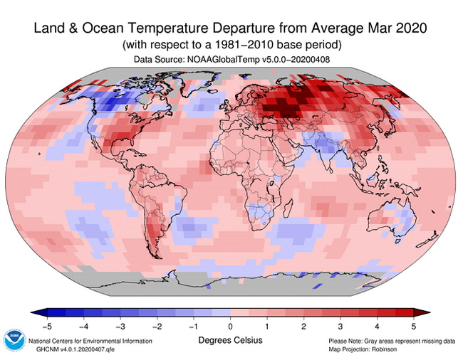 Март-2020 на планете стал вторым самым тёплым за всю историю наблюдений. До этого были рекордный январь и второй самый тёплый февраль. Россия оказалась на пике глобальных климатических процессов – здесь аномалия достигла максимума.