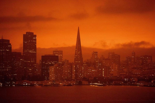Один из крупнейших городов США Сан-Франциско погрузился в мутно-красную мглу. Небо над городом напоминает марсианское. Или картинку из апокалиптического фильма «Бегущий по лезвию». Всё вокруг стало кислотно-красным. В алой дымке едва видны небоскрёбы.