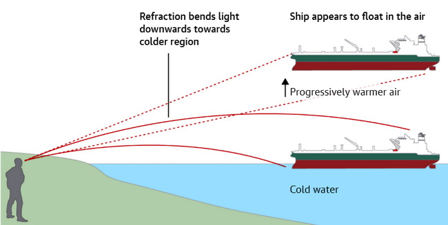 Далёкий корабль порой, кажется, парит высоко над своим фактическим положением, но иногда и объект ниже уровня горизонта может стать видимым.