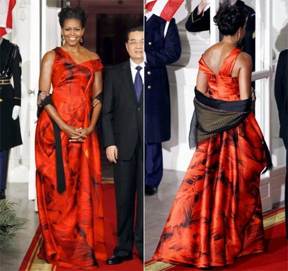 Первая леди США Мишель Обама поразила общественность, появившись на приеме в четь председателя ЦК КПК Ху Цзинтао в вызывающе ярком платье. Мало этого, это оказалось платье от Александр Маккуина – британского модельера и дизайнера, покончившего с собой чуть меньше года назад.