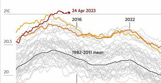 Тревогу исследователи впервые подняли несколько недель назад. Ученые-климатологи предупредили Guardian, что, по данным NOAA. средняя температура на поверхности океана в начале апреля составляла 21,1°C, превысив предыдущий максимум в 21°C, установленный в 2016 году.