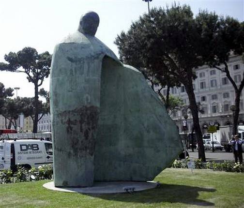 Скандалом обернулась затея отметить 91-й день рождения покойного папы Иоанна Павла II установкой памятника понитифику. Гигантская фигура из бронзы, воздвигнутая вблизи главного римского вокзала «Термини», вызвала оторопь и возмущение. Как сообщает Associated Press, горожане и туристы называют памятник уродливым и утверждают, что любимый народом папа больше похож на фашистского диктатора Муссолини, чем на самого себя.