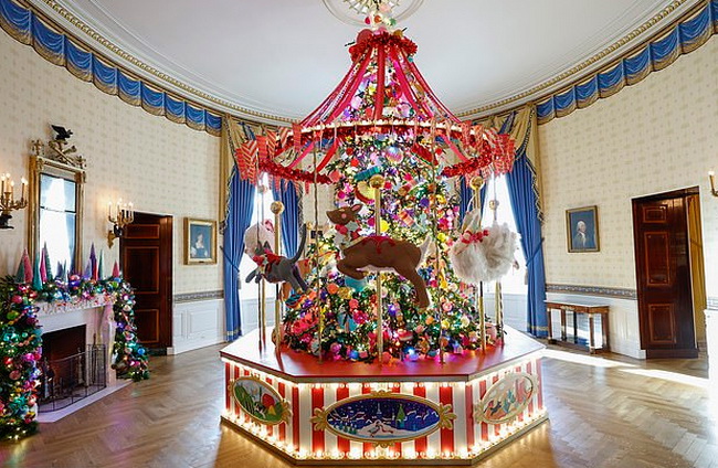 Как отмечают журналисты, в этом году официальную рождественскую ёлку Белого дома в синей комнате даже трудно разглядеть, поскольку она скрыта за каруселью из искусственных животных.