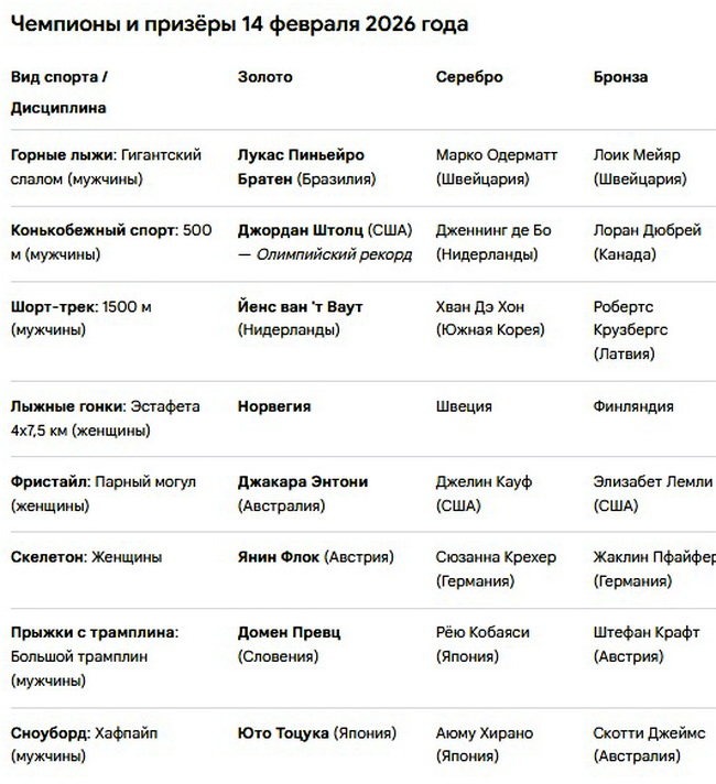 Восьмой день зимних Олимпийских игр 2026 года в Милане и Кортине-д'Ампеццо (14 февраля) принёс исторические достижения: Бразилия завоевала свою первую в истории медаль зимних Олимпиад (сразу золотую), а американский конькобежец Джордан Штолц установил олимпийский рекорд на 500-метровке.