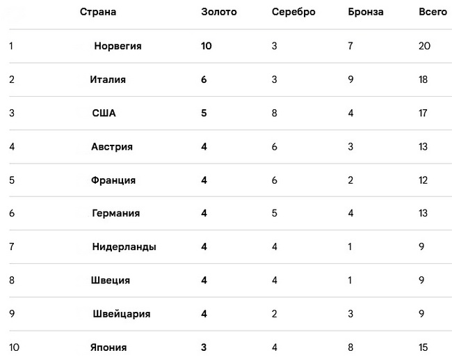 В медальном зачёте Норвегия упрочила своё лидерство.