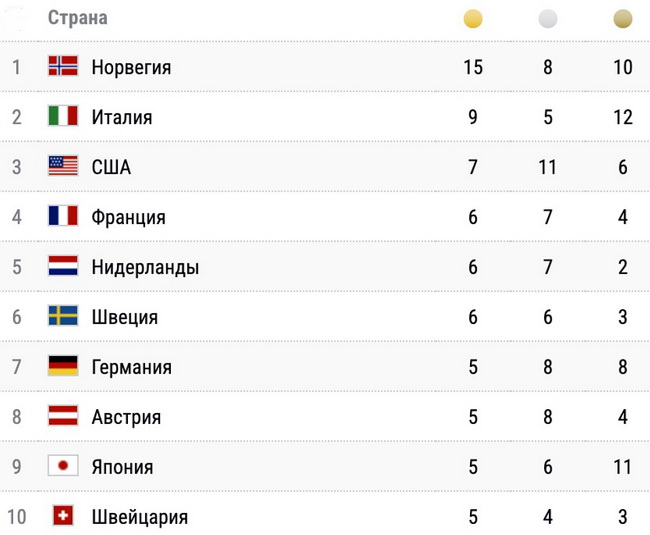 18 февраля на Олимпийских играх 2026 года в Италии были разыграны девять комплектов медалей. Лидером медального зачета после 12-го дня Игр-2026 остаётся Норвегия, у которой 15 золотых, 8 серебряных и 10 бронзовых наград. На втором месте – Италия (9-5-12), на третьем — США (7-11-6).