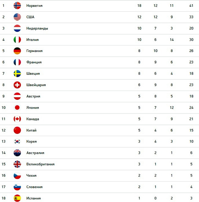 В медальном зачёте победила сборная Норвегии, завоевавшая 18 золотых, 12 серебряных и 11 бронзовых наград и установившая рекорд по количеству медалей высшего достоинства.