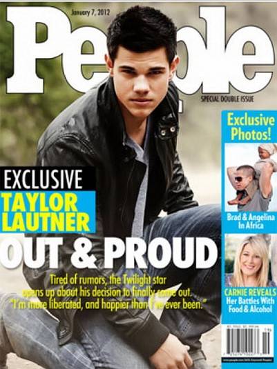 Обложка популярного журнала People с актером Тейлором Лотнером стала хитом интернета. Легко можно разглядеть, что 7 января должен выйти из печати выпуск журнала с интервью звезды «Сумерек». Заголовок гласит: «Раскован и горд». (Out & Proud). Якобы уставший от слухов Тейлор обещает рассказать, как все обстоит на самом деле.