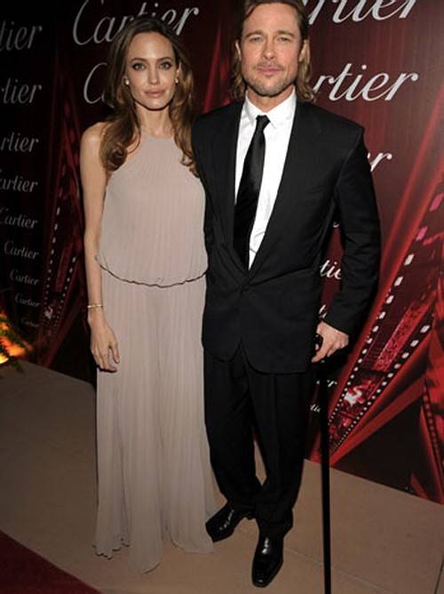 Анджелина Джоли, вышедшая на дорожку в шифоновом плиссированном платье цвета кофе с молоком от Эли Сааба, вступила в разговор, чтобы подержать партнера: