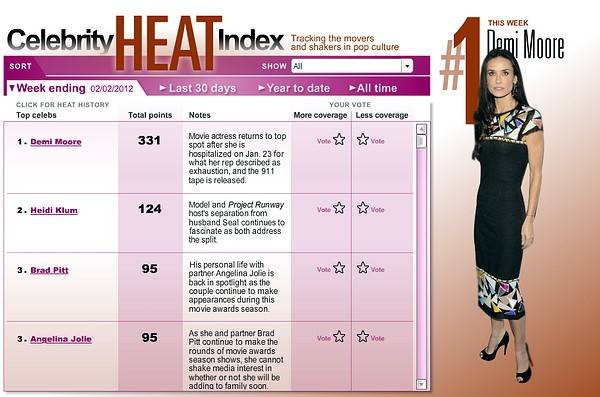 Подведены итоги пресс-недели 28 января - 3 февраля. Первое место в рейтинге популярности с большим отрывом заняла актриса Деми Мур. После разрыва с молодым мужем Эштоном Катчером Деми все чаще украшает собой страницы газет журналов. Впрочем, уже не украшает. От былой красоты звезды «Привидения» не осталось и следа. Актриса истощена морально и физически, она довела себя до больничной койки. Не совсем понятно, правда, отчего так страдает материально сверхобеспеченная особа, которую постоянно приглашают на роли в кино и которую не собрался бросать молодой супруг, пока Мур сама не сделал для этого все возможное и невозможное.