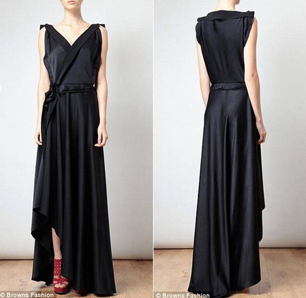 «Спереди у платья имеется глубокий перекрестный V-образный вырез, ниже искусственной поясной ремень и асимметричный подол. Задняя часть представляет собой ровную поверхность без вырезов и украшений». Кстати, стоимость этой модели – 3500 долларов.