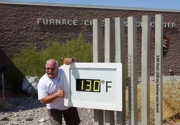 Кажется, еще немного - и будет установлен мировой рекорд температуры для планеты Земля. Пока он равен 56,7 °C (134 °F) и был установлен в Гринланд Ранч, Долина Смерти, Калифорния (США)10 июля 1913 года. В это воскресенье столбик термометра поднялся здесь до 130 градусов по Фаренгейту (54,5 °C).