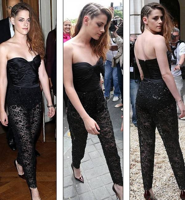 Голливудская актриса Кристен Стюарт появилась на Парижской неделе моды в полупрозрачном черном комбинезоне от ливанского дизайнера Зухера Мурада. Как отмечает пресса, ее взгляды были скорее колючими и злыми, чем томными и сексуальными.