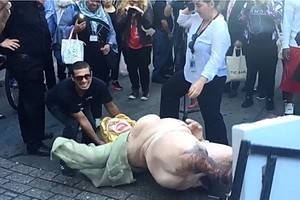 Художник Энтони Сиоли установил непристойную статуя Хиллари Клинтон в центре Манхэттена, что вызывало настоящий бой между защитниками современного искусства и женщинами, которые пытались уничтожить его образец.